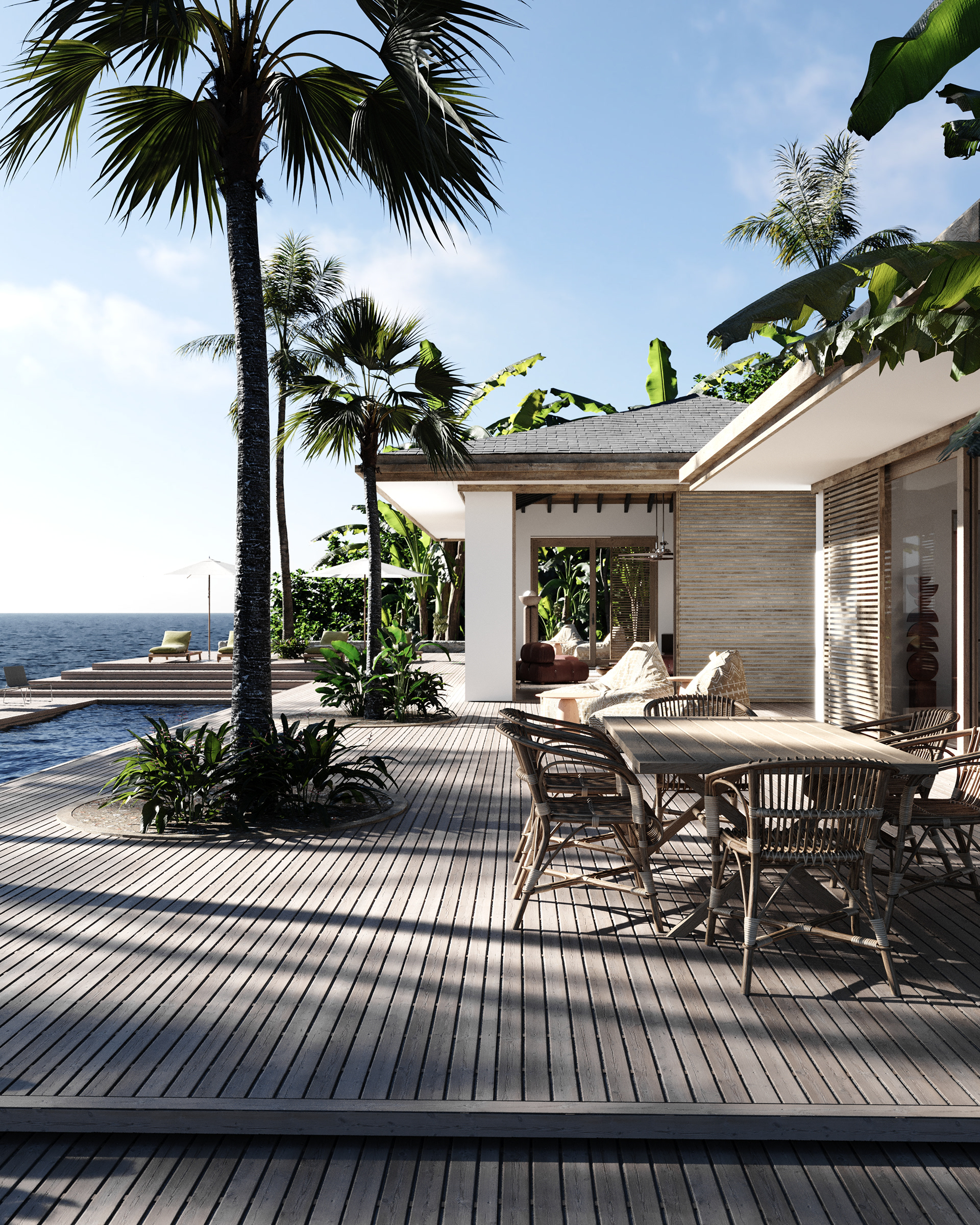 a tropical retreat designed to embrace the serenity of coastal living. With open spaces, natural materials, and an effortless blend of indoor and outdoor areas, this project is a celebration of tranquility and connection to nature.